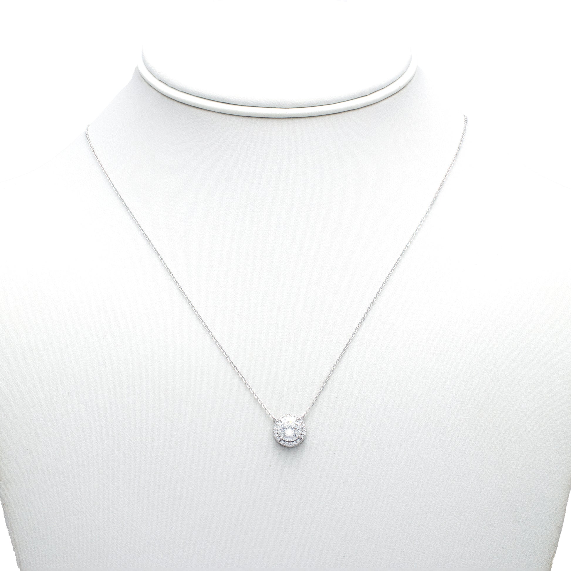 This necklace features the Celeste Halo Pendant, showcasing a brilliant round cubic zirconia stone encircled by a halo of smaller pavé-set crystals for added sparkle. The timeless design is set on a delicate ball chain, offering a graceful and radiant finish that elevates any ensemble with refined elegance.