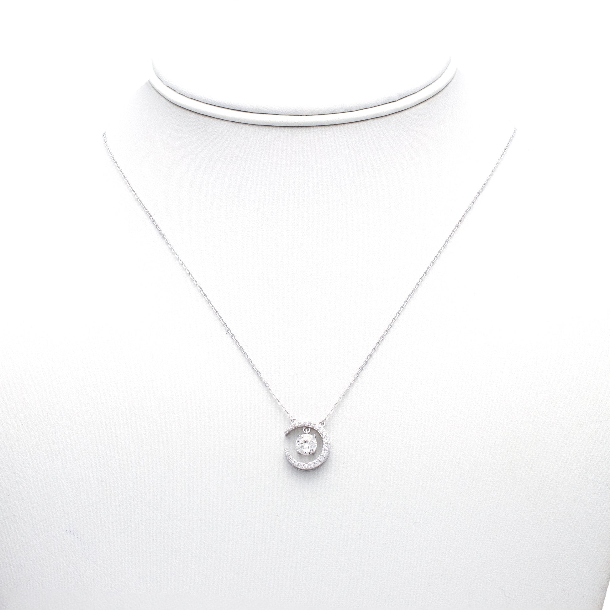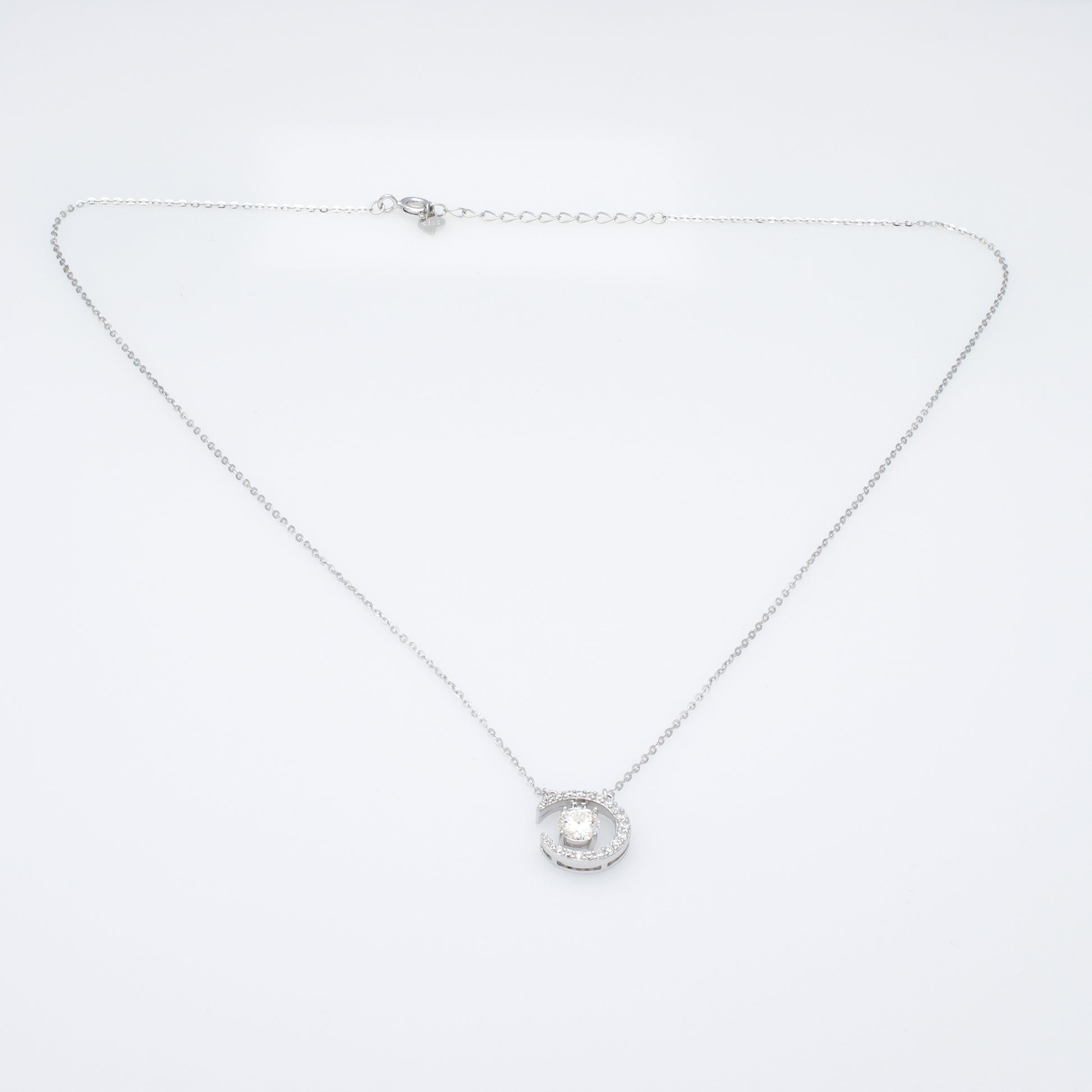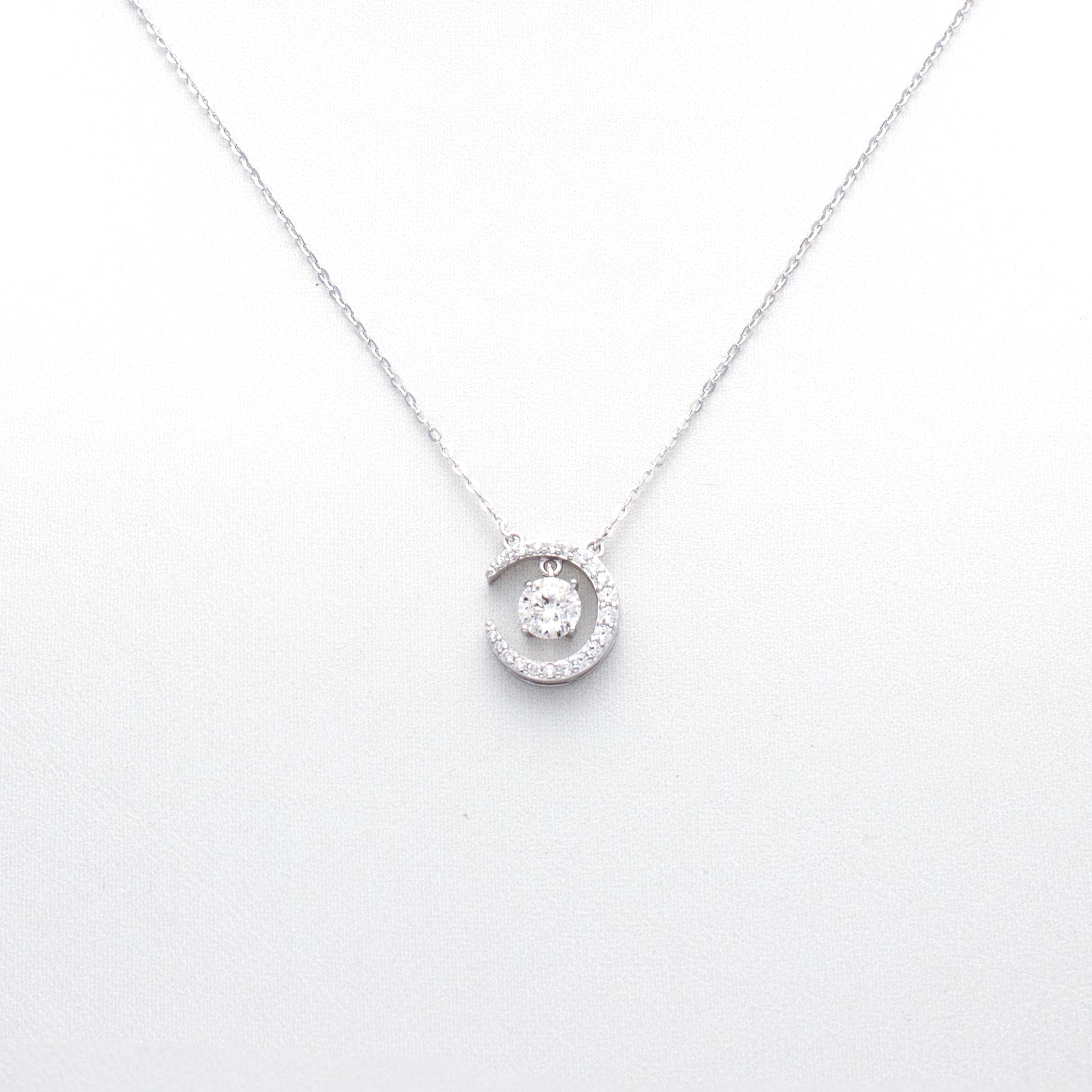 Sleek and graceful, this Celestial Moon Pendant Necklace in sterling silver captures the serene motion of the stars. A brilliant cubic zirconia rests at the center, encircled by a delicately curved halo encrusted with smaller stones that shimmer with every movement. The asymmetrical design gives a modern twist to a timeless shape, making it the perfect everyday piece with just the right amount of sparkle.