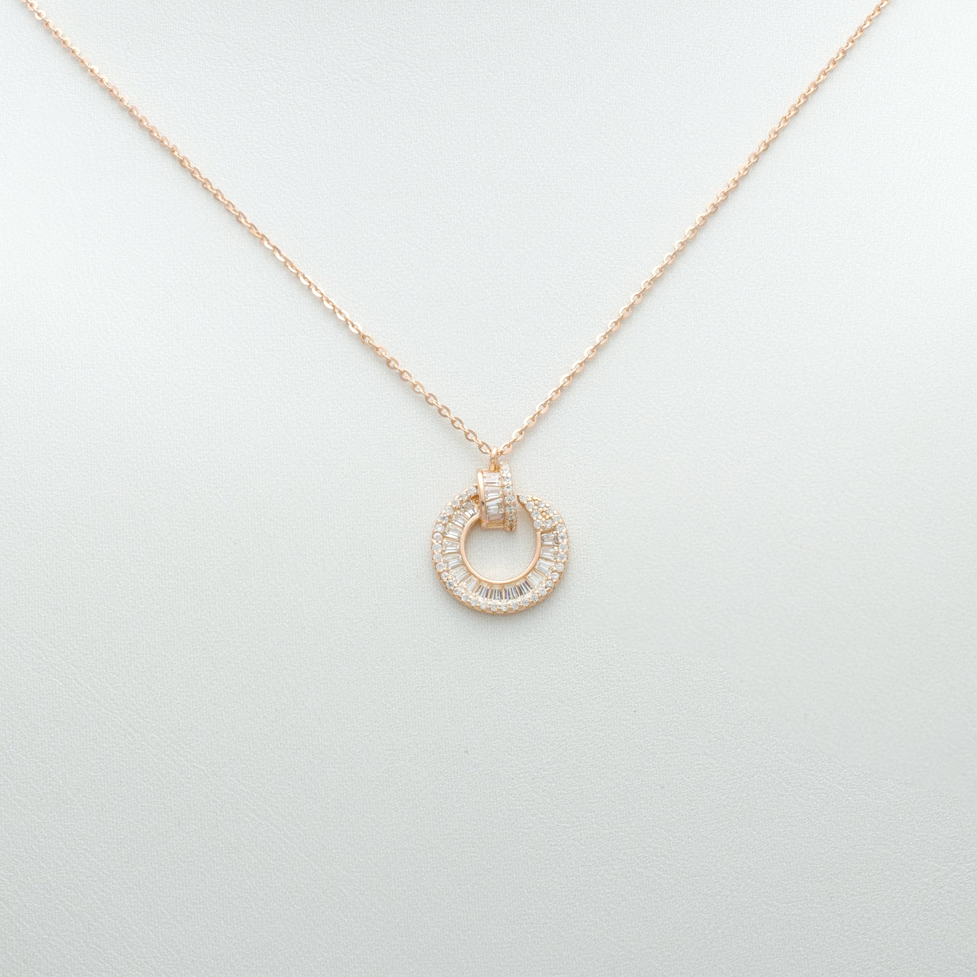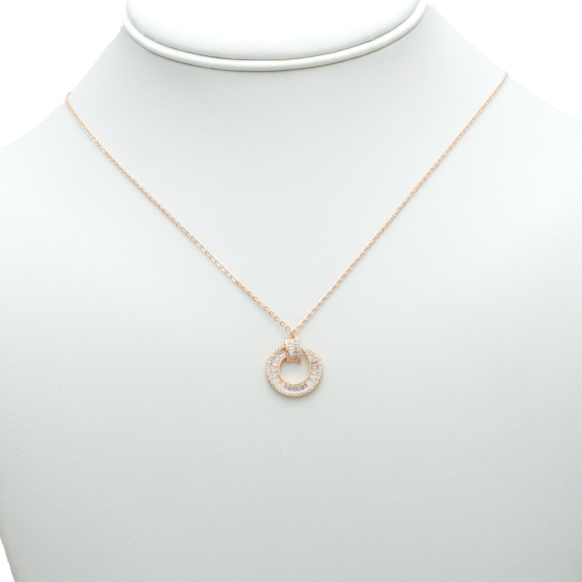 Timeless elegance meets modern simplicity in this Classic Pavé Double Circle Pendant Necklace. The pendant features two interlocking open circles—one smaller and one larger—both encrusted with fine pavé-set cubic zirconia stones that catch the light with every movement. The clean geometry and refined sparkle make this a versatile piece suited for any occasion.