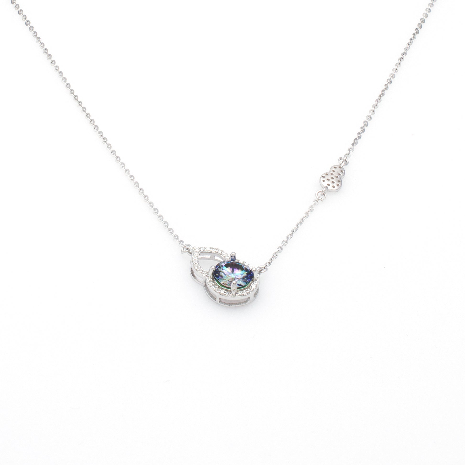 Playful yet elegant, this Cosmic Orbit Accent Necklace in sterling silver is a celestial-inspired piece with a romantic twist. At the center, a dazzling iridescent cubic zirconia sparkles with shifting hues, cradled by a sleek orbit-like crescent encrusted with clear baguette stones. A delicate heart charm placed asymmetrically along the chain adds a sweet and unexpected touch. With its galactic shimmer and thoughtful detailing, this necklace brings a dreamy charm to any outfit, from daywear to evening glam.