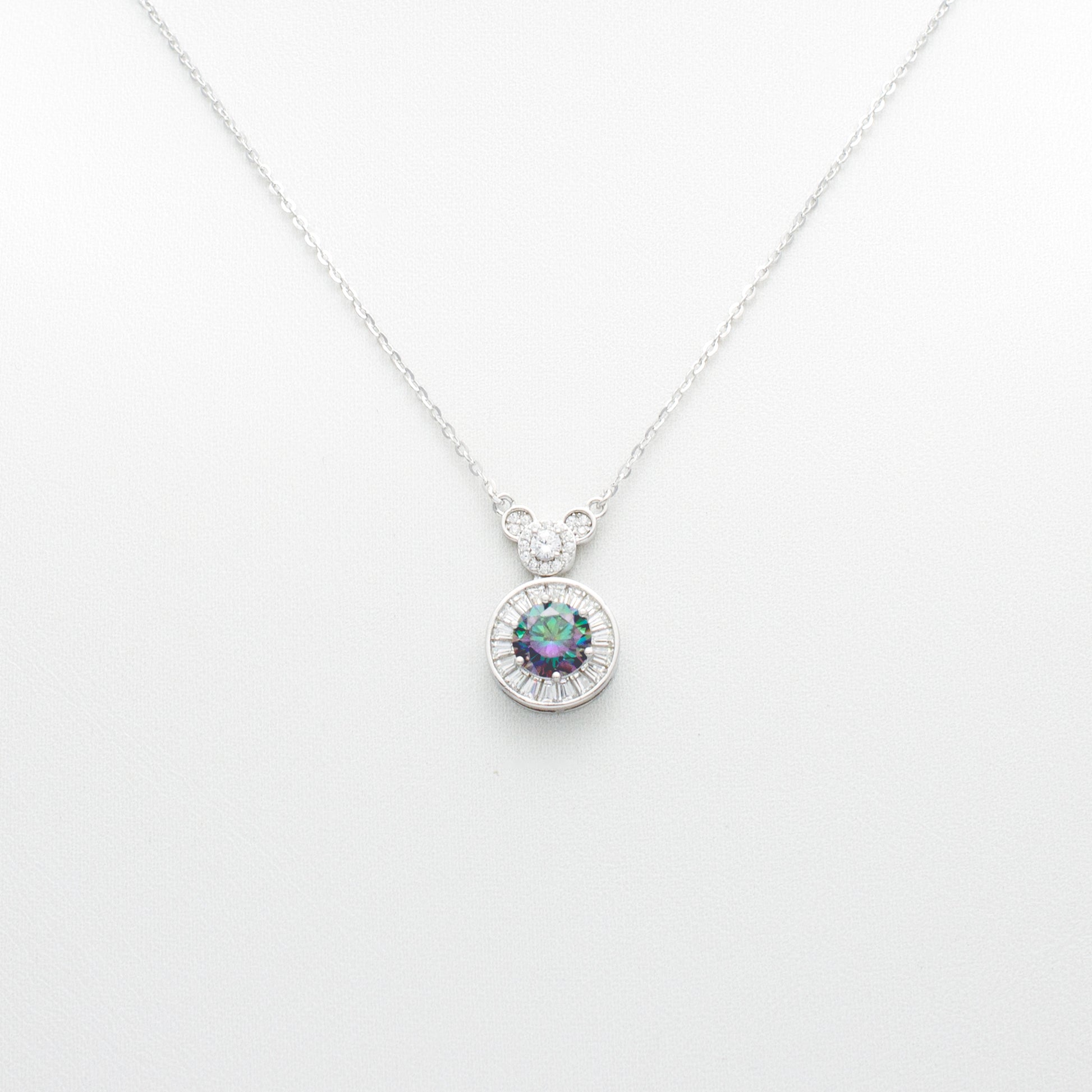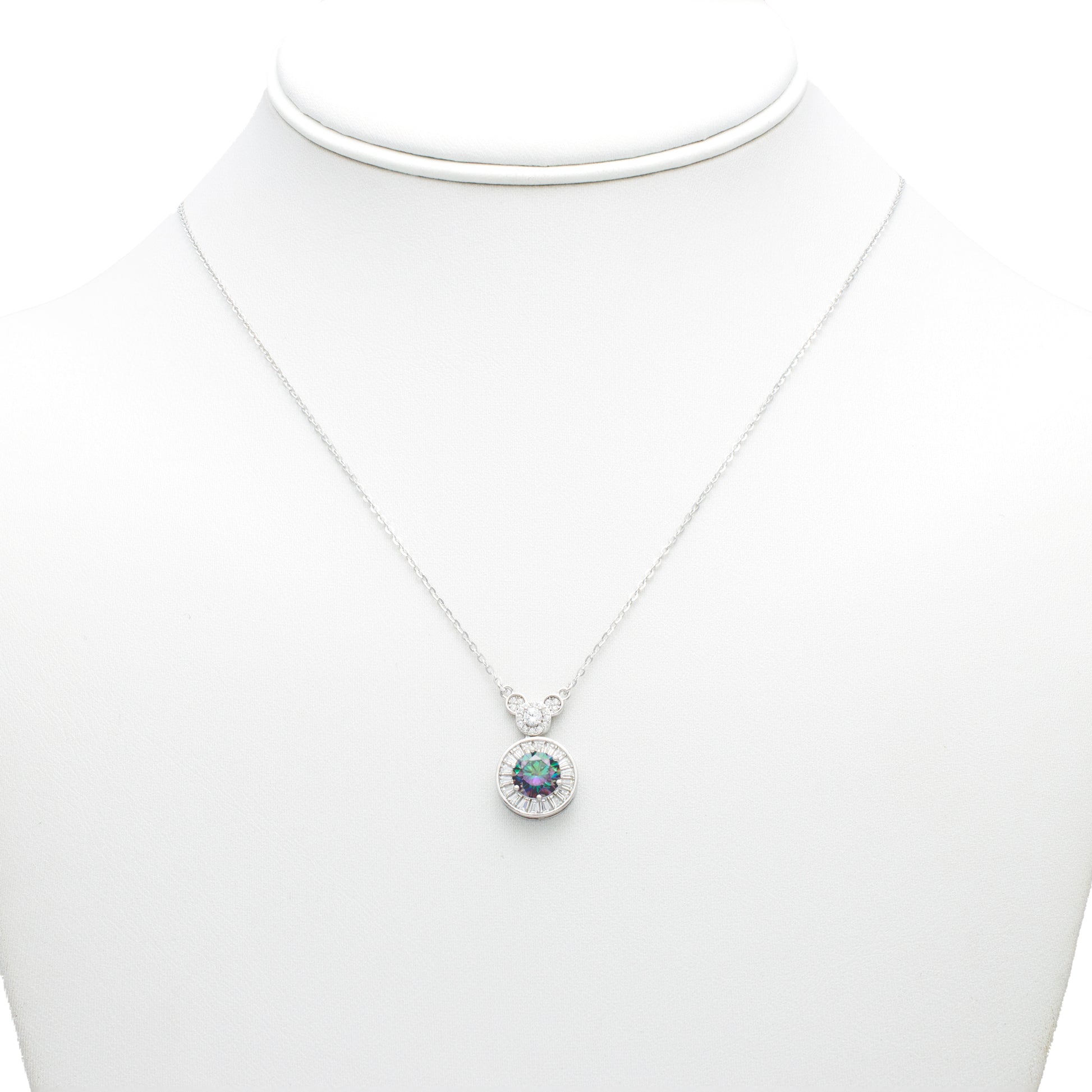 Navigate your style with elegance and purpose with the Iridescent Horizon Pendant Necklace. Centered with a shimmering mystic cubic zirconia, the pendant is framed by a radiant sunburst pattern that captures light from every angle. A delicate pavé-set bail adds a final touch of sparkle, creating a piece that feels both modern and celestial.