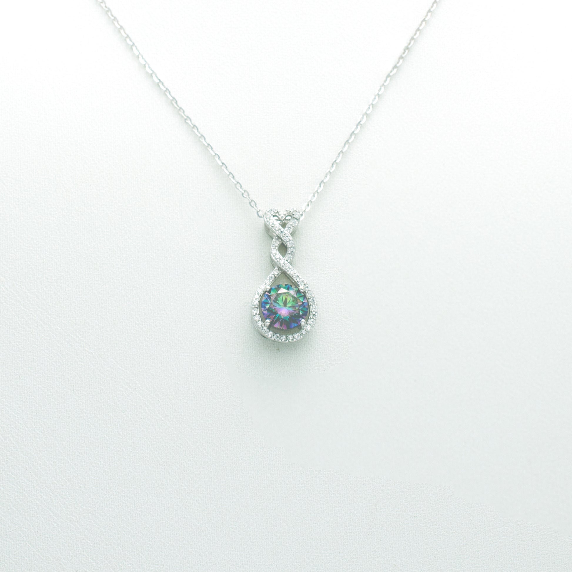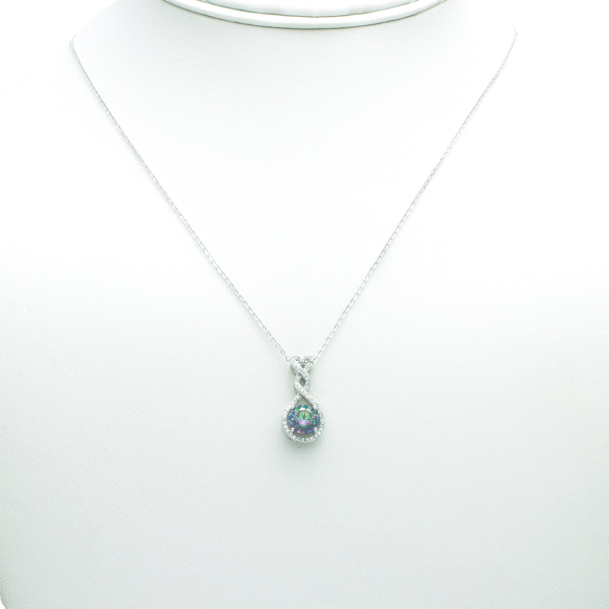 Step into ethereal elegance with the Twilight Halo Mystic Pendant Necklace. This mesmerizing piece showcases an iridescent round-cut stone that shifts between hues of blue, green, and violet, surrounded by a delicate pavé halo and an elegant twist detail at the top. Inspired by twilight skies and cosmic wonder, it offers a radiant yet refined touch.